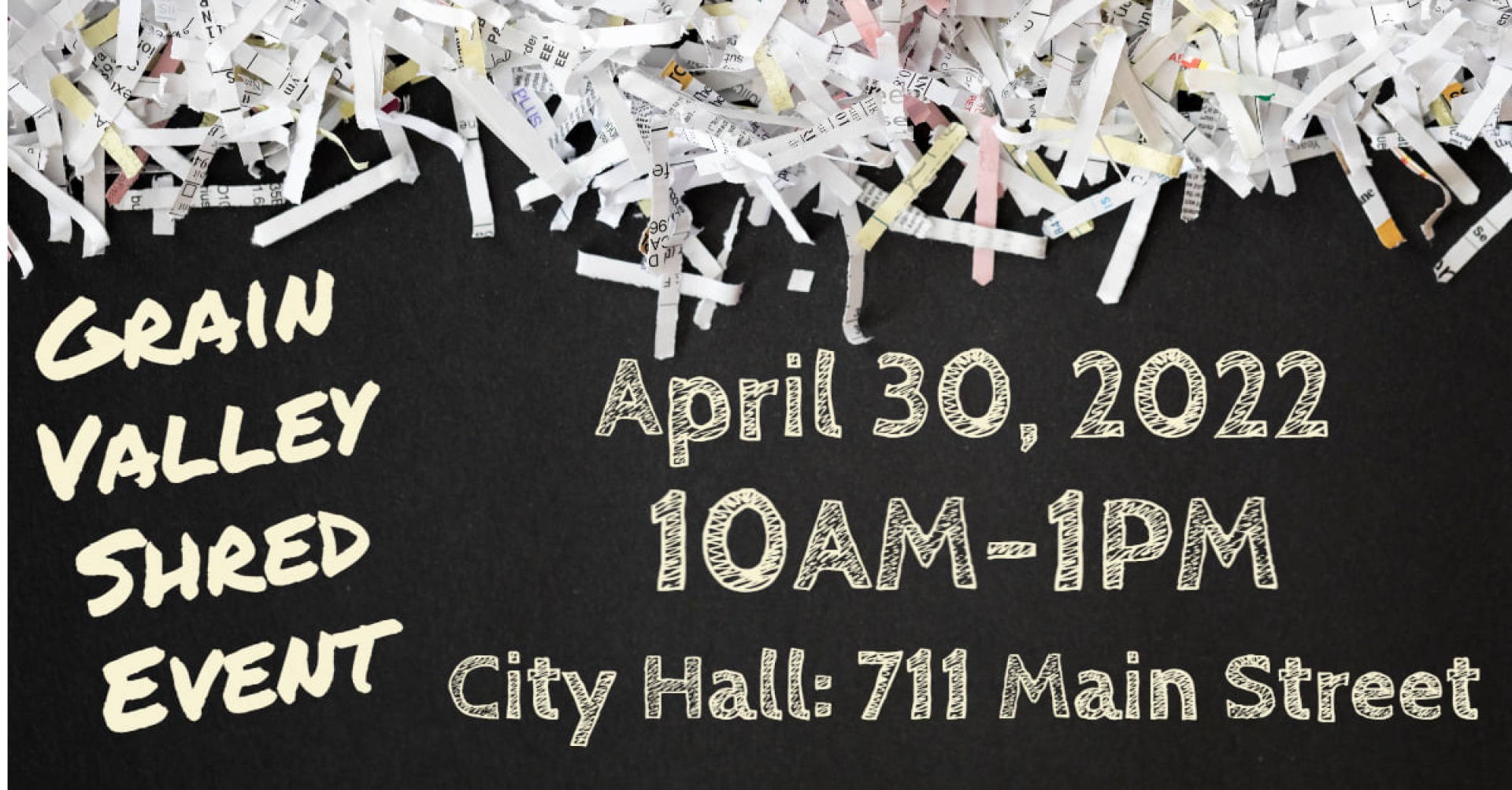 We will be hosting a shredding event for Grain Valley residents. The event will take place on the SE end of the City Hall parking lot.