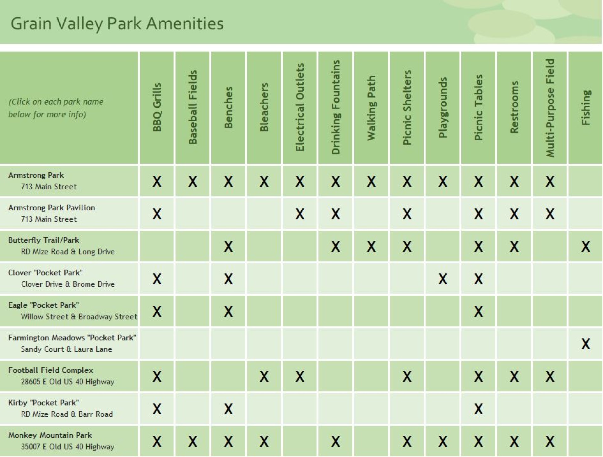 Armstrong Park 713 Main St · Grain Valley, MO 64029 ~ 6am to 11pm