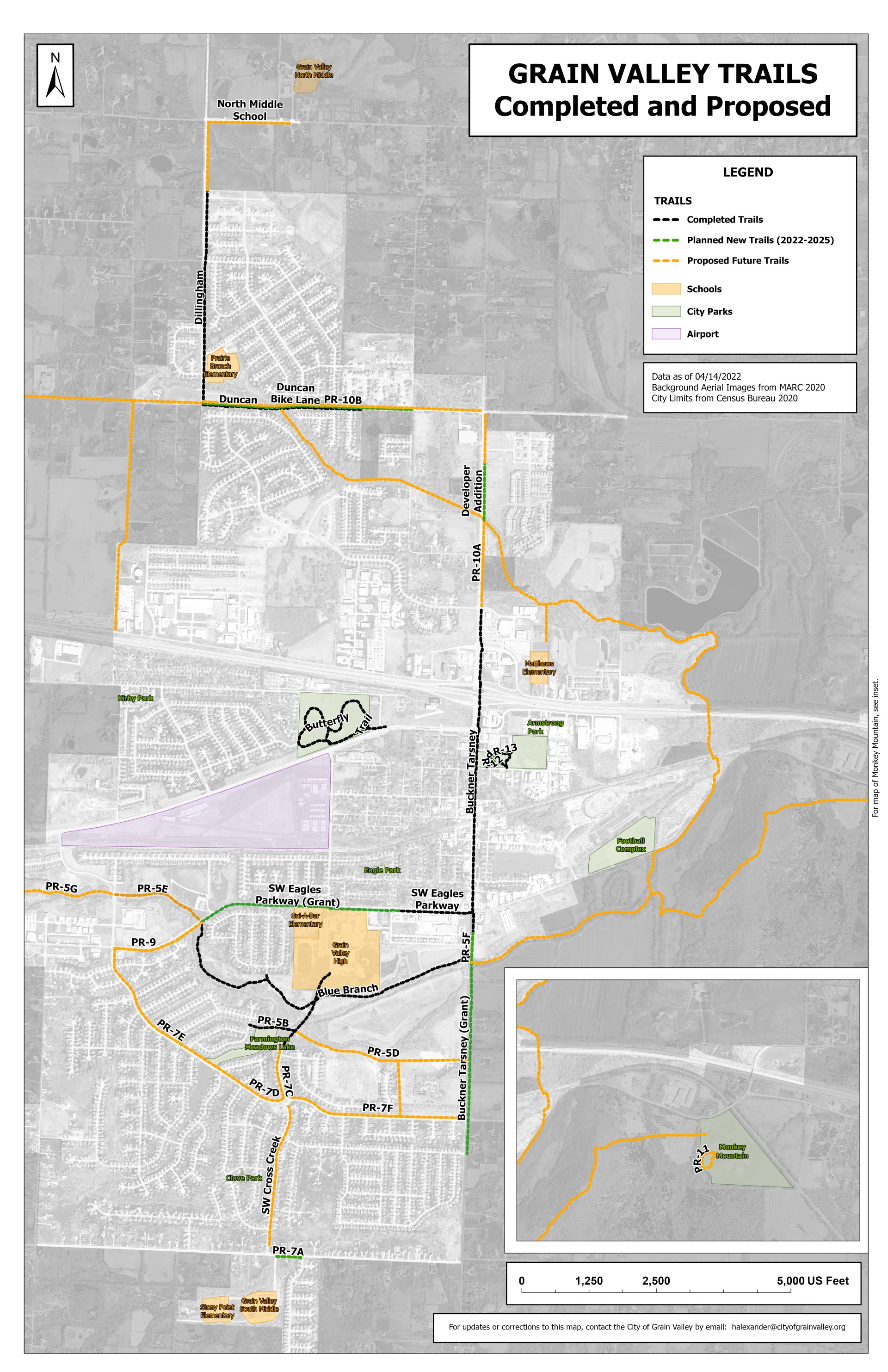 Grain Valley has many paved trails suitable for walking, running, or bike-riding near many neighborhoods and schools. New trails are being added/extended each year.